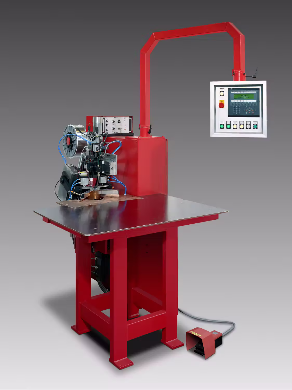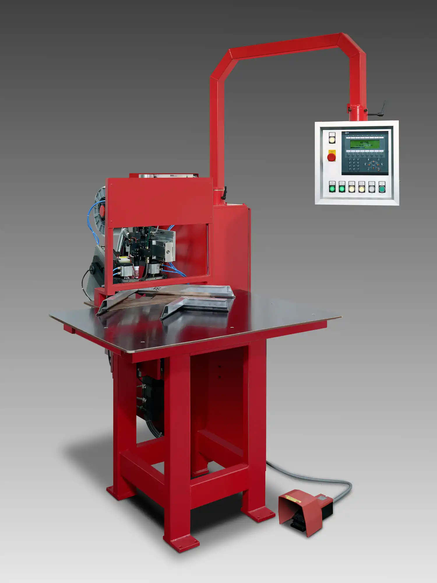 Diese Sonderausführung ist für Bauteile mit großer Eckenhöhe ausgelegt. Über eine integrierte Scherenhebebühne wird das Werkstück auf Position gebracht und in der Schweißvorrichtung fixiert. Die Maschine eignet sich besonders für Anwendungen mit hohen, rotationssymmetrischen Gehäusen – z. B. Spitalschränke oder vertikal aufgebaute Blechkomponenten.Die Eckenhöhe ist in dieser Variante auf bis zu 900 mm ausgelegt.